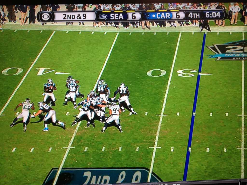 This is Cam out of the shotgun. He does a quick play fake, and then this happened. The blue line is the line of scrimmage. The play resulted in a sack. I'm willing to bet the majority of drop backs looked like this.
