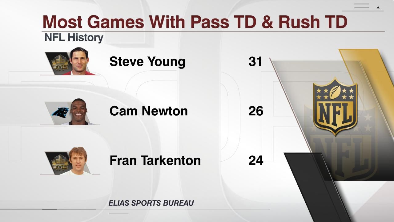 Just three games into his fifth season, the Panthers' starter notched his 26th game with a passing and rushing touchdown. Only Steve Young has done it more in NFL history.