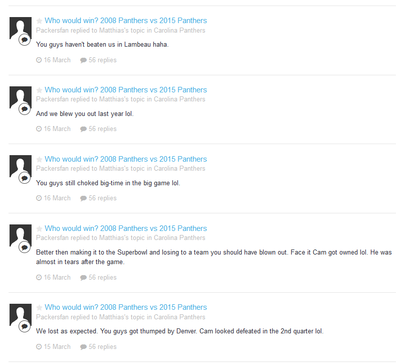 edit: actually if you check his post history one of the first things there is him popping into a completely unrelated thread and talking trash about our super bowl loss and cam newton.  that's troll behavior.  are you sure you checked it yourself?  what if he was a falcons or saints fan and did that?