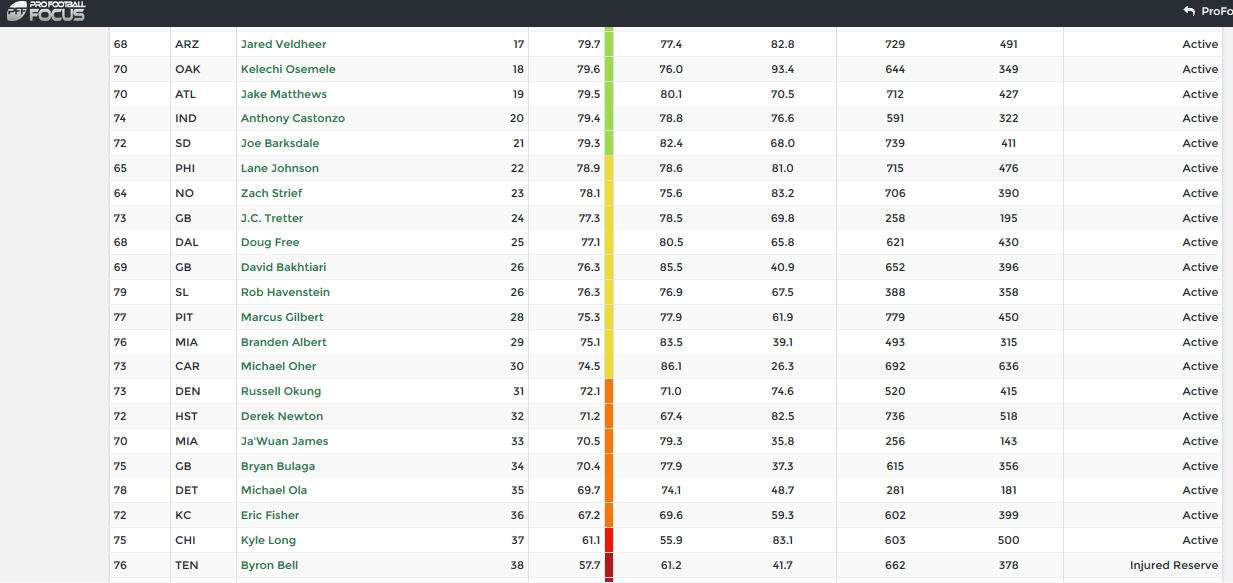 So.....  I find it very hard to trust any of these stats from PFF.   Was Oher ranked 30th or 47th among tackles last year?    Was he 10th, 12th or 17th in terms of pass protection?    For a someone who enjoys statistics, the opaqueness of PFF's grading - especially for the less "stat-dependent" positions like Oline - is very maddening.   I find it harder and harder to take any of their stats and grades seriously.