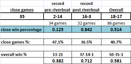 Here are some averages for the full 7 year data set I examined re: close wins:
