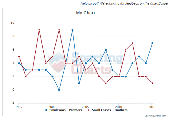 Thanks to Sporting Charts, here's the Panthers Small Win-Loss differential for each season of their history.  We had the highest small win-loss differential ever in 2015, with 7 wins out of 8 games decided by 1 - 9 points.  (for a +6 Small W-L differential)