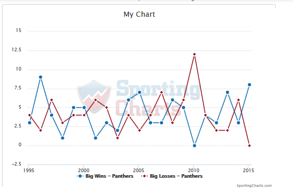 And off-topic, but just for fun....  Here is the comparison of big wins and big losses ("big" = 10+ points)  over the years: