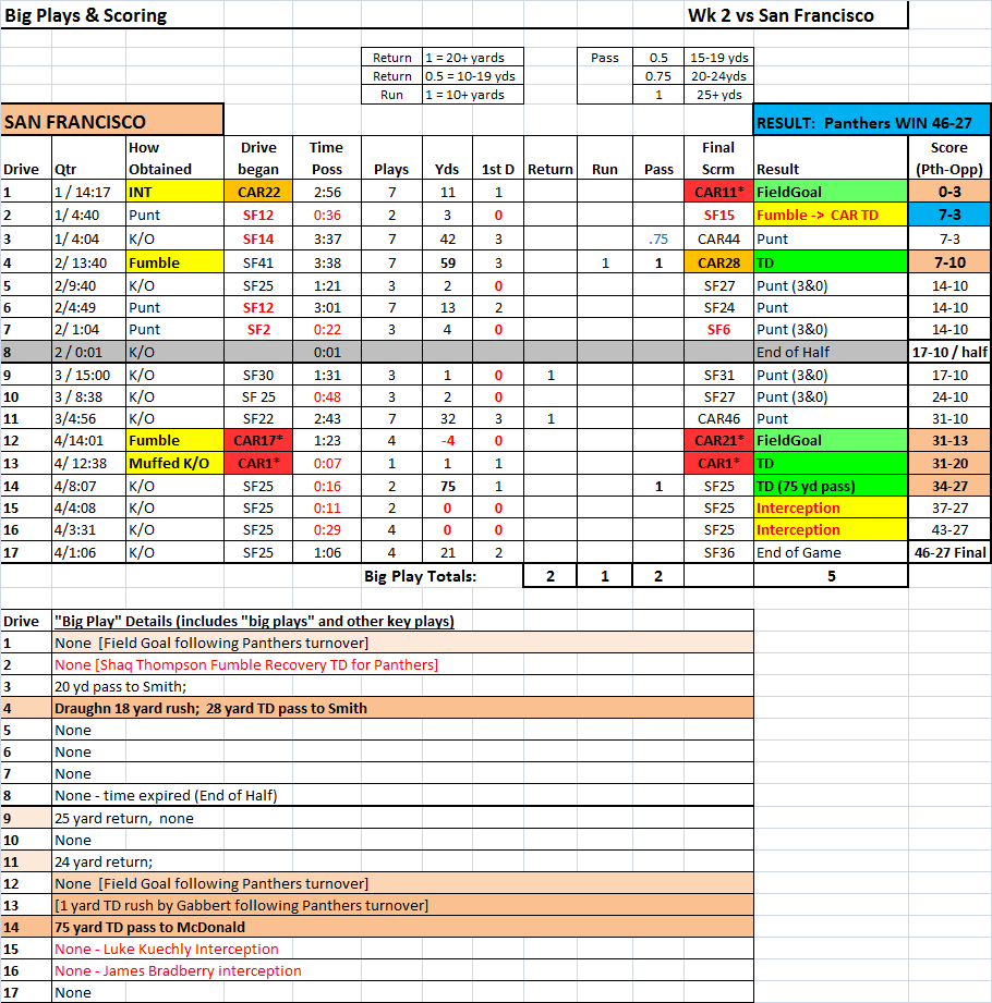 Panthers had big plays (including long returns) on 9 consecutive drives, scoring on 6 of those.  Nice.  This week I included info on a few big plays negated by penalties, just as a bit more information.  As before, I also included some info on passes in the 15 - 24 yard range, but those are not counted in the "big play" totals at the bottom of the tables.