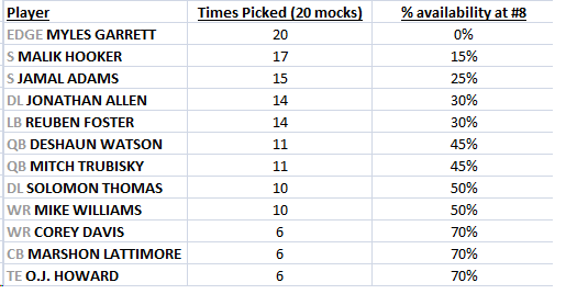 Here are the 12 players that went off the board in the top 7 in these 20 mock drafts I just ran, and the % chance of their being available for us at #8 based on these 20 drafts.