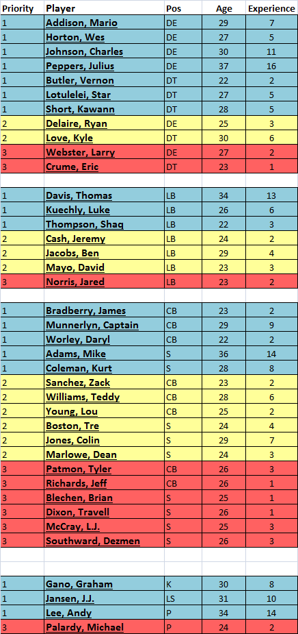 On Defense:  DANG, Dave Gettleman has done a fantastic job this off-season filling holes.  Apart from the question of the AGE of a lot of our players on defense (a valid concern, which I'll address in a minute), I'd be pretty happy with our potential 53 man roster (the blue & yellow guys) even if we didn't add ANY new player on defense!  Seriously, look at that defensive roster and realize that for ANY new draft pick on defense to make the 53 man roster, one of the 26 players in blue or yellow is going to have to go.  WOW.  TOUGH TOUGH choices ahead in building the roster on defense.