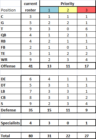 Here's an overview of the roster broken down by position, and with an attempt to subdivide the players for each position into 3 priorities.