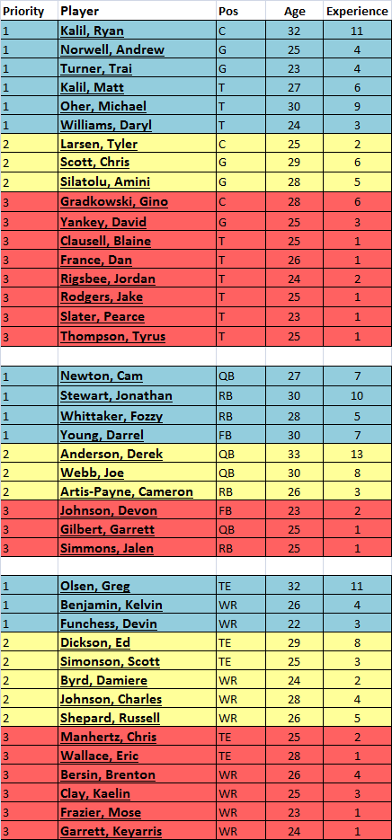 While it is WAY WAY WAY too early to make any real roster predictions, I did find it helpful to review the roster today, trying to further assess at what positions the Panthers could really use help from the draft and to look at what players might already be on the bubble, at the risk of being released if we draft new talent.