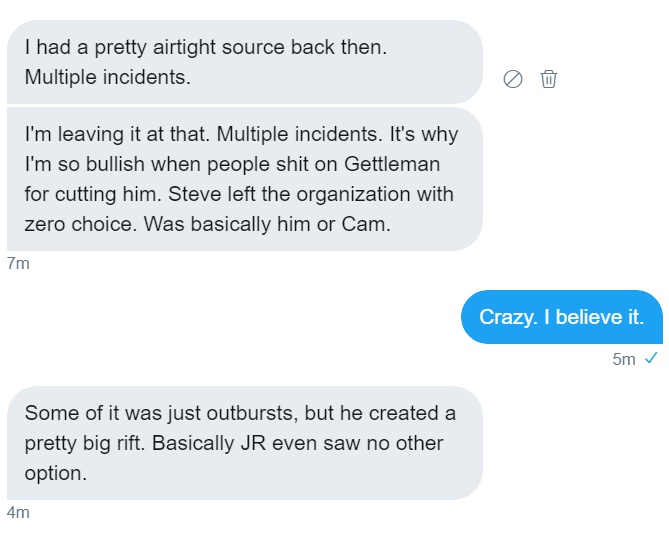 thats all the details i've got. i can't verify the story but this guy heard the entire thing straight from gettleman over a bottle of glenmorangie la santa and he's been a trustworthy source to date. he has absolutely nothing to gain by making this up. if true this is an incredibly interesting piece of the puzzle and would cast gettleman in a new light, as well as certainly steve smith and how we remember that 2013 season.