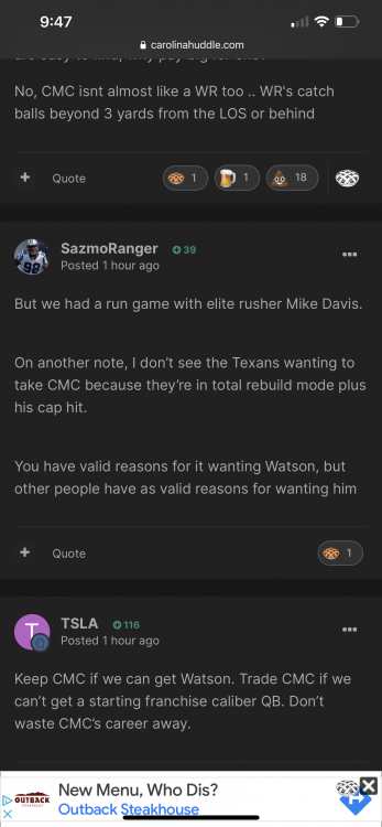 CMC is great, love him. But if we gotta lose him to finally reacquire a stud franchise QB then so be it. We don’t “have no o-line”.  We have a decent backup RB. We can find another RB in the draft easier than a QB.  All things considered, the leap from Bridgewater to Watson is infinitely greater than from Davis to CMC.  So I hope we don’t lose CMC, but I’m willing to for Watson.