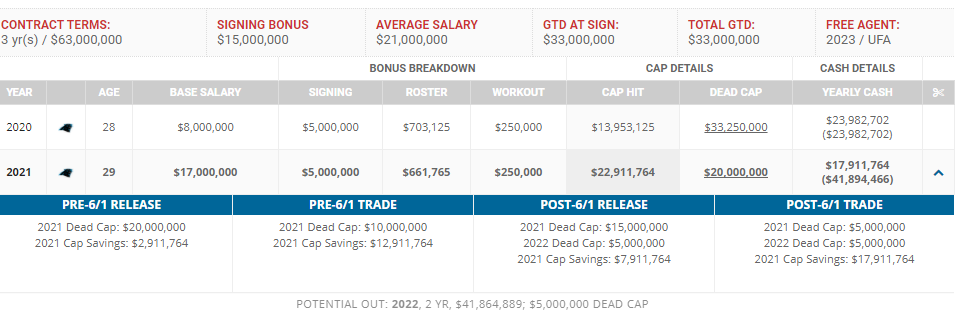 So Carolina will be paying the bulk of his salary in Denver and taking a 17 m dead cap hit at home lol.