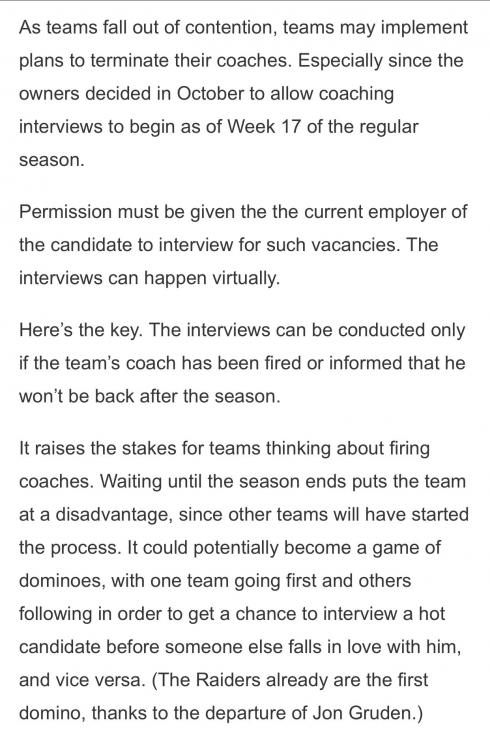 Go back to the info you posted on page one about the rule change. It says that teams can interview as long as they've told their current coach he won't be back, even if he's not officially fired.