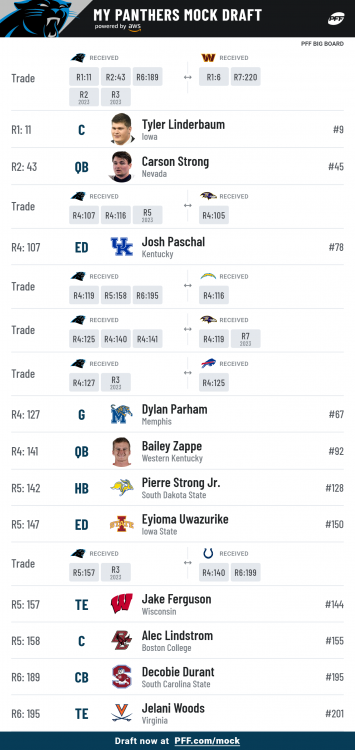 It's that time of year again where fans divide themselves into two camps: LT or QB? I'd like to propose a 3rd camp: Center. LT is commonly screamed for as the 2nd most important position on a team due to protecting the QB's blindside, but the league's best pass rushers aren't coming from just the blindside. They're coming from all angles! I recall reading an article years and years ago that did a deep dive into which position was statistically the most devastating to a team and QB was shockingly #2. Losing a center was the biggest impact to a team's playoff chances, according to the data. Am I proposing that the center is the most important position on the field? Absolutely not. Am I proposing that drafting the best offensive lineman is more beneficial to the Panthers than drafting the 2nd best tackle after the Jets inevitably scoop Evan Neal to replace Morgan Moses after his 1-yr deal expires? Yes, I most certainly am. Tyler Linderbaum is THE #1 OL prospect this year, and he's got the type of background you want in an interior lineman: a former heavyweight wrestler (so he's great with hand fighting and leverage), former defensive lineman (so he's got that built in nastiness), Academic All-Big Ten (so he's a hard study), and more. He's also a leader, being one of seven sophomores named to the 2020 Iowa Leadership Group and also majoring in enterprise leadership. This dude is a beast, and having him and Chrisensen on rookie deals together will help with offsetting Taylor Moton's escalating cost.