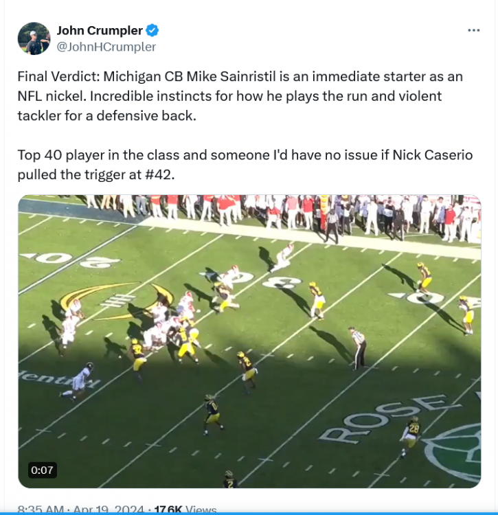 🚨Tony Pauline: Panthers interested in CB Mike Sainristril @33