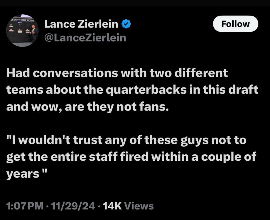 Let’s be honest there are no QBs worth a #1 pick in this class.  None.  Carson Beck has all the talent but not seeing the mindset to be great.  The rest…naw not seeing it.