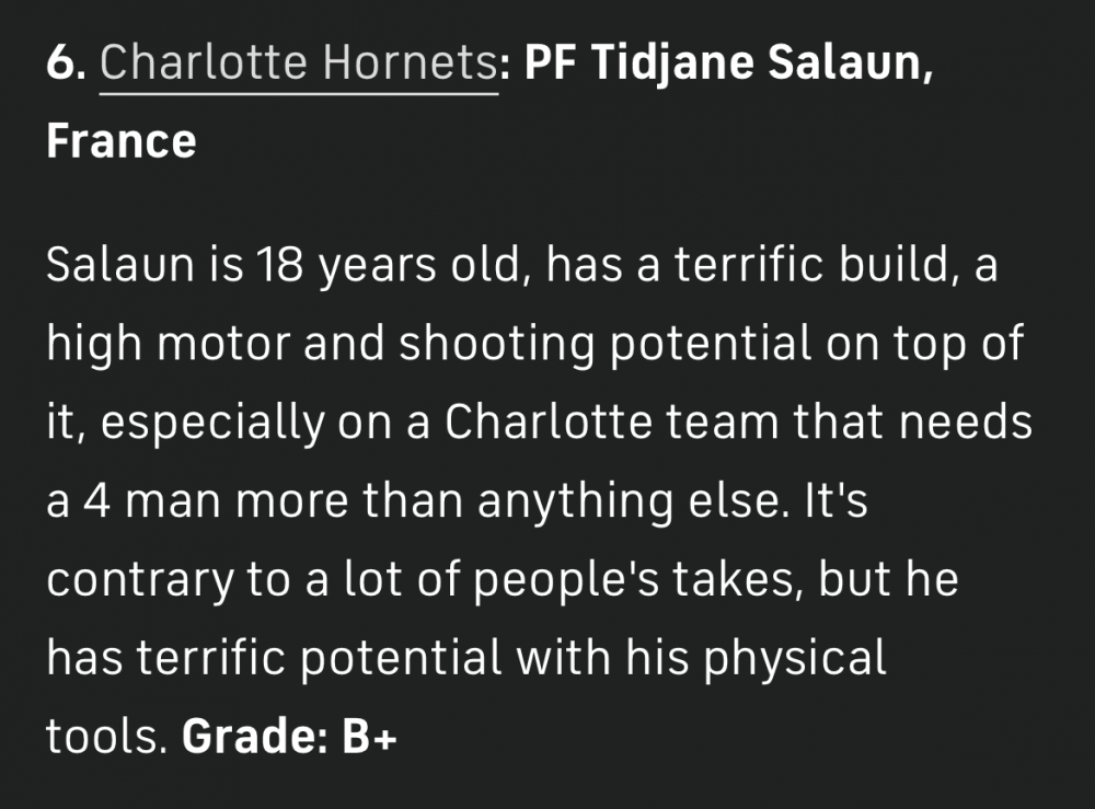 This kid has decent size and athleticism, and he can shoot the 3. I can see him developing into a 3&D stretch pf. I had him as a trade back option. We obviously liked him enough to draft at #6. Hope he works out.
