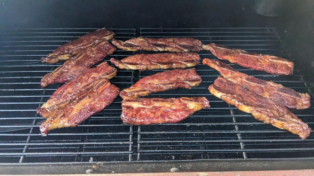 second started on a saturday night for a sunday dinner. i only have a medium GE so i can't get the big ones, but it was decent sized. probably about 17 hours on the smoker. had to change the lump like 6 or 7 times, then i think i let it sit for 2 hours. i was so fuging high by that point i can't remember