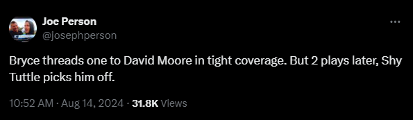 So, to be devil's advocate, Bryce didn't throw a ton of interceptions and he didn't have a ton of Sam Darnold boneheaded INTs. He had a few, but he only threw 10 total INTs on the year. League average INT% was 2.3. Bryce was well below that at 1.9.