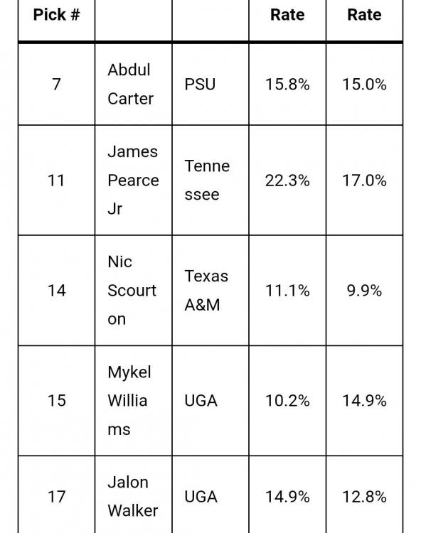 I have read various perspectives, some with Sanders going mid round, but I think there will be 2 QBs going in the top 5.  With the exception of the Kenny Pickett year, most years QBs creep up boards the closer we get to April.  This is going to sound crazy, but I could see will Howard going in round 1.  How you perform on the biggest stage carries a lot of weight.  Depending on what Rodgers decides in his Oregon black hole of meditation, it is possible that only Jax and NE (picking before us) do not need a QB--five of seven teams.  How do you not take Sanders if he is sitting there? Someone will bite.  Furthermore, Jalen Milroe reminds me of Anthony Richardson who was drafted fairly early, and Quinn Ewers reminds me of Bo Nix.  All it takes is one team (see Pickett, Kenny).  Howard's stock is about to explode--I think he goes round 1--I could see a team like the Raiders, Colts, or Steelers taking Howard.  Once the chips start getting pushed to the center of the table, people will overpay.