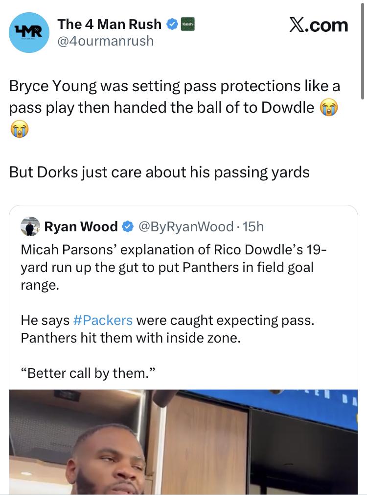 Most folks are enjoying an impressive road win against a playoff team myself included. You're one of few who are taking this opportunity to throw other players under the bus to shield your guy instead of praising the key players on both sides of the ball who fueled this win