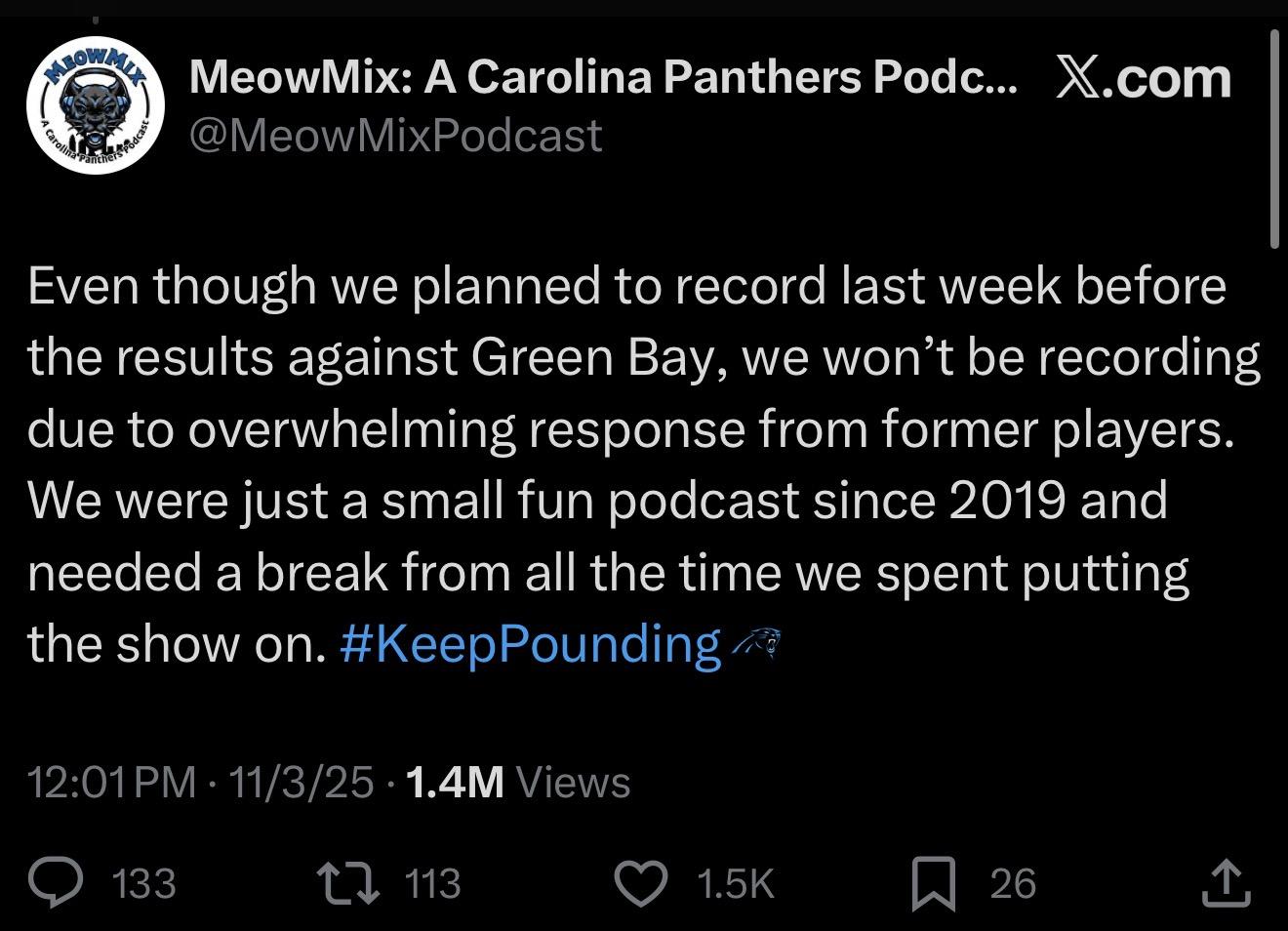 At the end of the day they created the whole spectacle. Nobody made them make a public announcement for attention declaring they were done after one blowout loss. They could have said absolutely nothing and just taken a week or even a month off and who would have noticed or cared or complained? The Panthers haven't had a winning season since 2017 so if they couldn't handle losses why did they even start a podcast to begin with? The majority of twitter is nothing but attention seeking grifters at every corner. Boring.