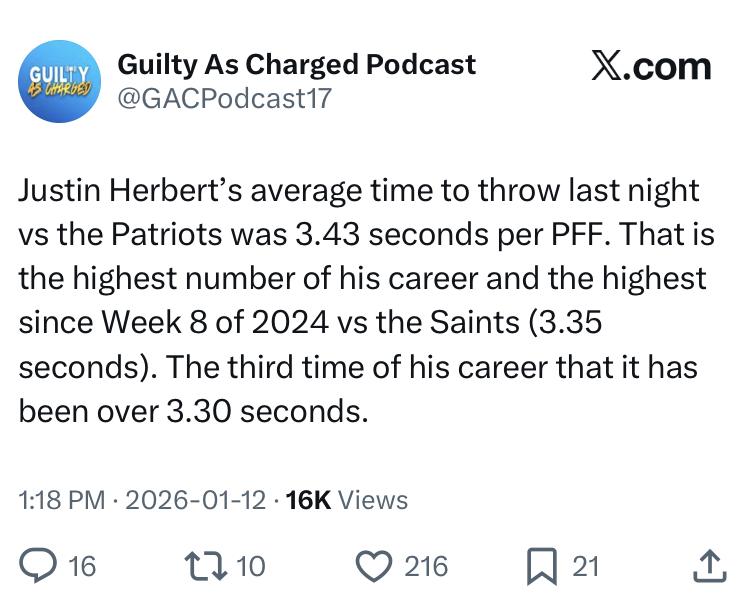 • Yuck.  I still kind of like Herbert but these playoff performances are rough....