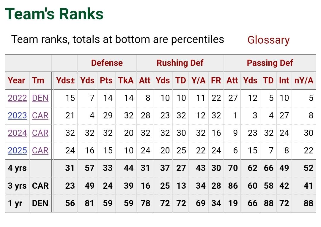 To that point, if you look at all those rankings from the three years Fangio(of whom Evero is a noted disciple) it shows a progression of getting steadily better into the far more elite defense it is now under Vance Joseph.